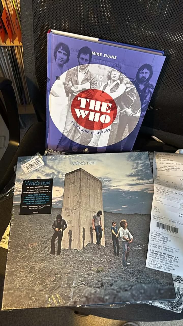 J’avais vu sur le site de la Fnac quelques jours avant, un coffret de The Who ! Coïncidence ? Je ne crois pas ! Un coffret avec l’album Who’s next, paru en 1975. Et inclus dans ce coffret, un concert : The Who Live at the Civic Auditorium, San Francisco 1971. L’album Who’s next et un concert, 4 LP pour 19,99€ !! Mais comme j’avais déjà l’album, un pressage de 1972, acheté en 1974, et toujours dans ma vinylethèque (ça remonte n’est-ce pas !), je m’étais dis en mon fort intérieur que j’allais faire l’impasse. Et puis ce matin en rentrant des courses, le signe était évident. Vous êtres d’accord, je sais ! Et le pire, ou le mieux, le coffret est disponible à la Fnac d’Aix en Provence, et j’ai 3€ sur ma carte Fnac, et je viens d’acheter un gros bouquin sur les Who le matin même. Le ciel me fait un signe, c’est clair comme de l’eau de roche !! Bref, j’ai craqué, pour 16,99€, et mon vieil exemplaire ira rejoindre la pile de vinyles pour les échanges avec mon ami Julien, disquaire. Juste une petite larmiche, à l’intérieur de la pochette j’avais marqué après mon achat mon nom et prénom. Mais foin de tout sentimentalisme. Un beau coffret et sans aucun doute un beau live à découvrir. Le destin !!!
